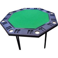 Host your next poker night in style with Rio's Octagon Foldaway Poker Table. It measures 52 inches (corner to corner) and will accommodate up to eight players. The green felt playing surface is comfortable and level, and prevents chips and cards from unwanted shifting. Designed for alternating dealer play, this table also features eight cup holders, chip trays, and pass-throughs for a comfortable evening of poker. The table's legs fold flat to allow for easy storage.User Ratings: