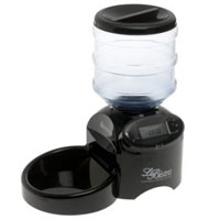 Petmate Automatic Pet Feeder Great for cats and dogs, this fully automatic pet feeder features a tough plastic base that holds a food reservoir for food "on demand." The electronic pet feeder's simple, programmable electronics prompt the feeder to dispense portions from 1/4 to 2 cups at three selected times per day. The unit can be set to meet scheduled feeding times and amounts when caretakers are away, but it is not meant to replace human care--please be sure someone still visits the pet daily. The unit's hopper holds 4-1/5 pounds of food and accommodates a full range of dry food sizes, shapes, and types. Required batteries, which are not included, sustain a long battery life of six months. Read More | Compare Prices