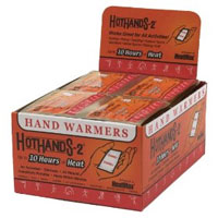 Heatmax Hot Hands 2 Handwarmer (40 pairs) Designed for skiers, hunters, fishermen, golfers, or anyone who works or plays in the cold for long hours, the Heatmax HotHands-2 Hand Warmers are air-activated and will provide up to 10 hours of soothing warmth inside gloves, pockets or wherever you feel a chill. All Heatmax warmers are made of natural materials, including iron powder, water, salt, activated charcoal, and wood fiber. When exposed to air, these materials react together to produce heat through an extremely fast oxidation (or rusting) process. User Ratings: 72 reviews Price: $33 Read More | Compare Prices
