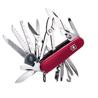 Victorinox Swiss Army Swiss Champ Pocket Knife Complete set of Swiss Army tools to use while camping, hiking, fishing, and more. Contains 32 stainless-steel tools including blades, can oppener, small screwdriver, can opener, bottle opener, corkscrew, large screwdriver, wire stripper, scissors, pliers, wire cutter, wood saw, magnifying glass, fish scaler, hook disgorger, ruler, metal saw, and more