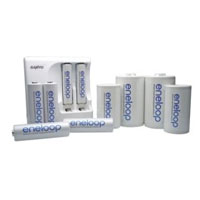 Sanyo Eneloop Rechargeable Travel Power Pack Combining the best features of alkaline (ready for use) and rechargeable (reusable) batteries, the Enelope batteries can maintain 85 percent of capacity after 1 year of storage with its extremely slow self-discharge rate. It can also be charged up to 1,000 times (including partially) without experiencing memory effect. The travel pack includes C and D battery spacers, a compact charger, 4 AA batteries, and 2 AAA batteries. Read More | Compare Prices